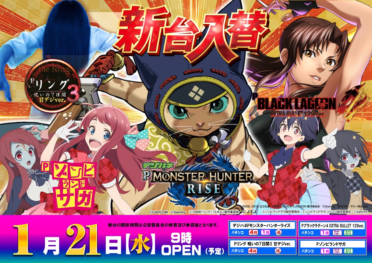 | 1月21日 | Pリング 呪いの7日間3 甘デジver.(4&1パチ) デジハネPモンスターハンターライズ(1パチ) Pブラックラグーン4 EXTRA BULLET 129ver.(1パチ) Pゾンビランドサガ(1パチ) |